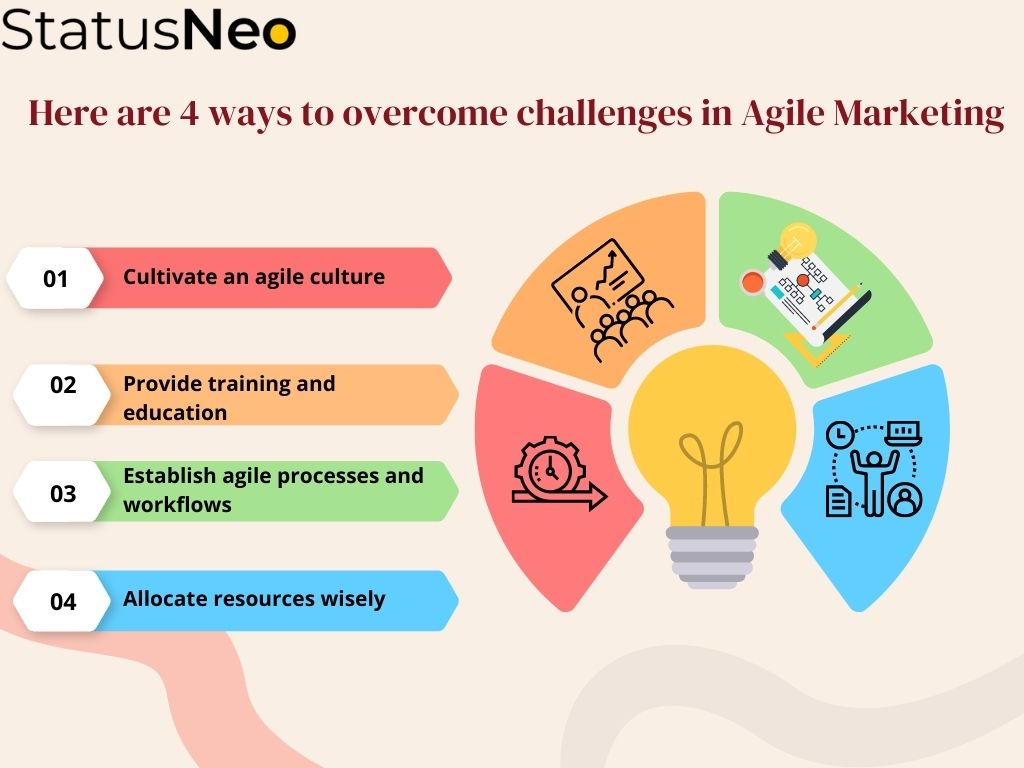 - Training and education: Agile marketing requires a different skill set than traditional marketing approaches, including Agile methodologies, project management, and collaboration skills. Organizations need to provide training and education to ensure that their teams have the necessary skills and knowledge to adopt Agile marketing approach.