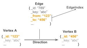 For each document, a unique _id attribute is stored automatically. To build a relation (i.e., an edge) between two documents (i.e., vertices), both _id attributes are stored in a special edge document known as _from and _to attributes, forming a directed connection between two arbitrary vertices. Edges are then stored in a special edge collection.