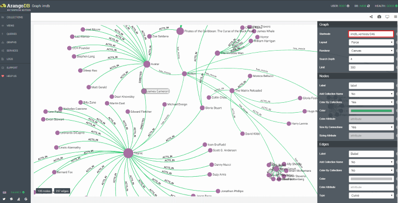 A graph can be visualized and manipulated directly within the ArangoDB WebUI. The WebUI provides many configurations for displaying edges and vertices. Here is a view of the IMDB dataset with its search depth set to 4, results limited to 300, the edge visualization type has been set to curved, and with custom vertex and edge labels. This gives a quick view of genres, movies in those genres, and actors who played in those movies.