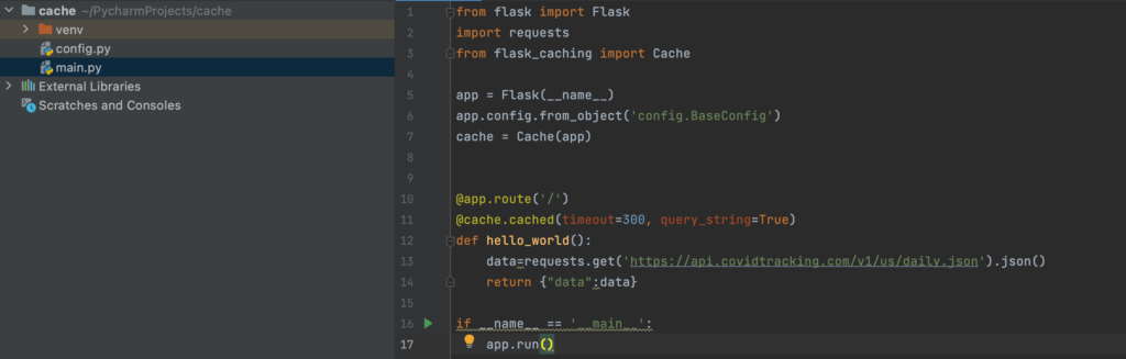 - Now in our main file, we are going to add this configuration to our app and app caching to our API’s.
