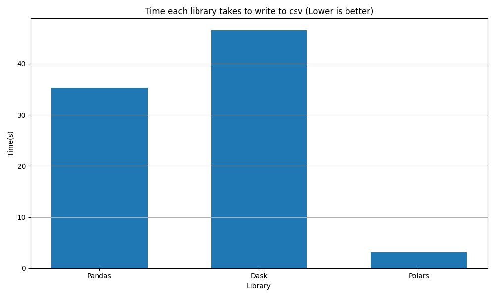 The plot below depicts the time taken (in seconds) by Pandas, Dask, and Polars to generate a CSV file from a given Pandas DataFrame. The number of rows of CSV is 10 million.