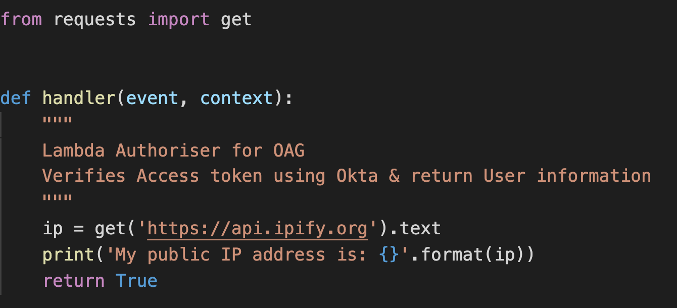 Before you are able to run & test the lambda, we are going to create a small script, which will use python’s request module and hit an open-source API which will return my Public IP Address.