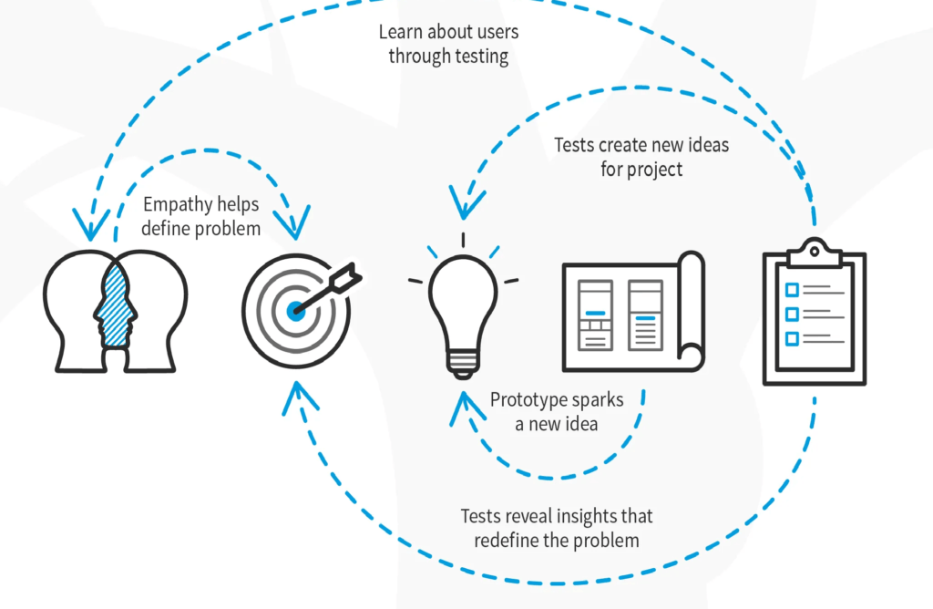 There are 5 stages to the non-linear, iterative process of design thinking. Empathize, define, ideate, prototype, and test, in that order. At any time during the process, you can carry out the phases concurrently, repeat them, and go back to a previous step