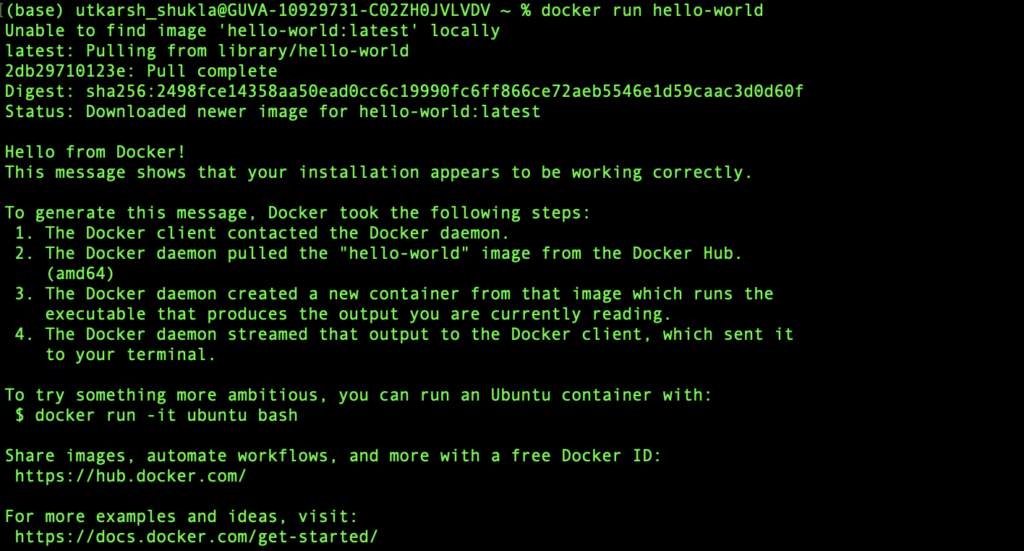 - Here we can see that the image was not present on our local system, so it downloaded/pulled the image for us and has shown the Hello from Docker !, message.