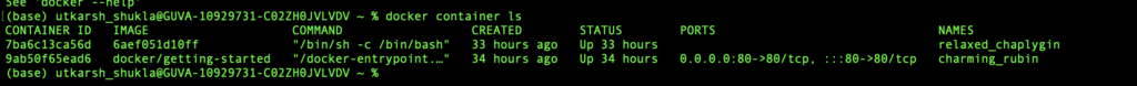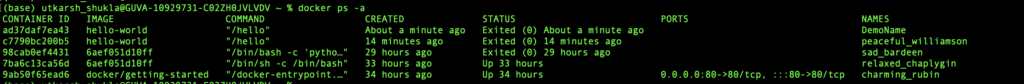- Here we can the name of the image, container id container name as well as status and their creation time with ports.