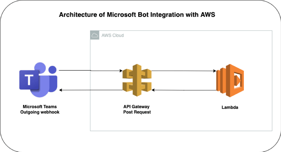 At the back end the lambda function is triggered through API gateway and the code is executed in the AWS cloud and a response is sent back to Microsoft Teams.
