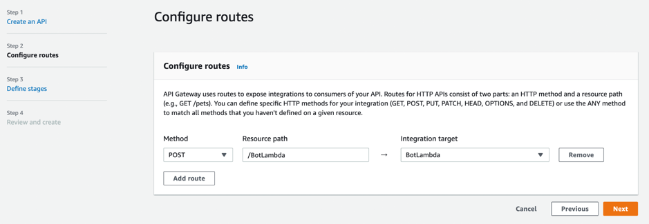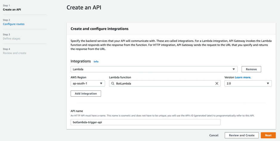 Now you’ve created an HTTP API with a Lambda integration that’s ready to receive requests from outgoing webhook.
