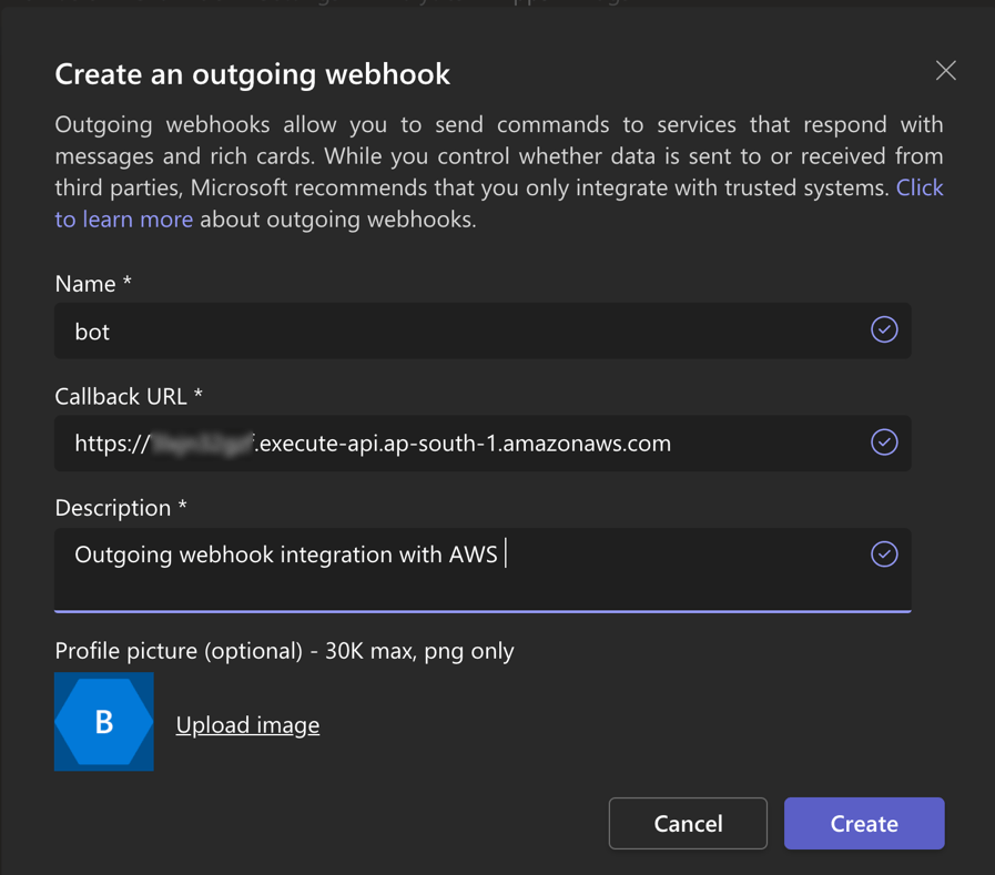 - Fill out details to create the outgoing webhook. i.e. Name of the outgoing webhook, in the callback URL add the API gateway URL, description and profile picture.