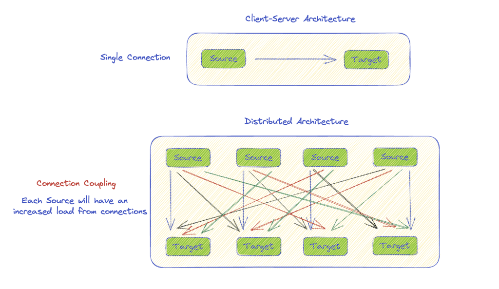 Prior understanding to Kafka, we should understand the problem Kafka try to solve. In simple Client-Server architecture source machine needs to create a connection with target machine, however an enterprise or distributed architecture can have multiple sources and target machines. Thus each source will increase connection load on source machines.