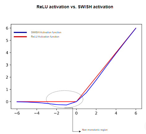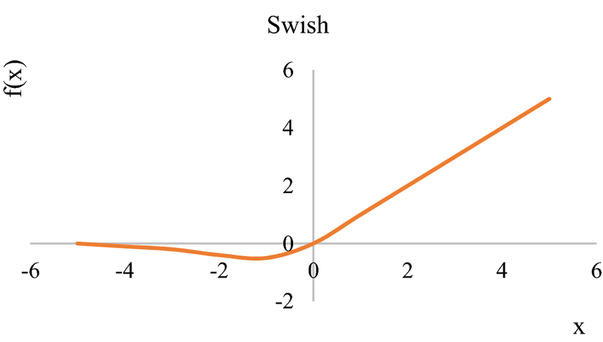 Non-Monotonicity: Unlike ReLU, which is a piecewise linear function, Swish has a non-monotonic shape. This can allow the function to capture more complex patterns in the data and potentially improve the representation power of the network.