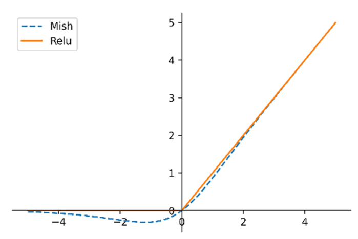 The Mish activation function has a similar range to ReLU and Swish, which is (−∞,+∞). It introduces a smooth curve that is steeper in the center than ReLU and Swish, and it tapers off gently towards both ends.