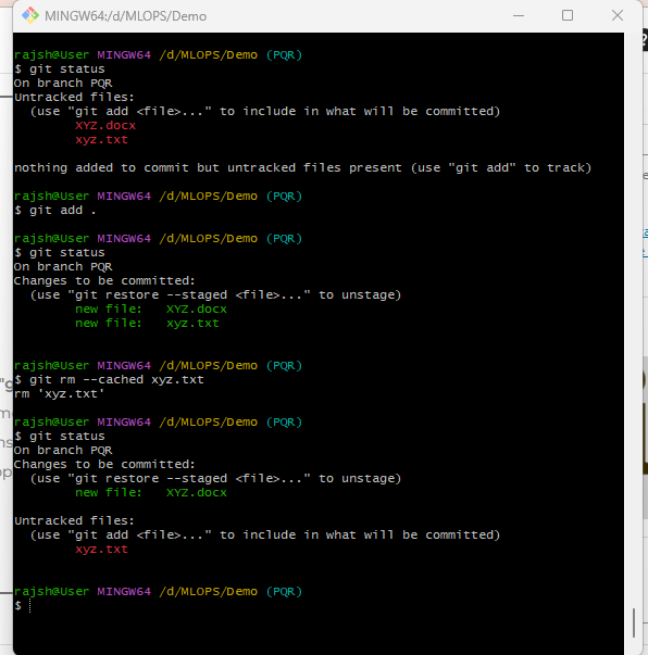 This is the primary command used for removing files from git’s version control. ‘git rm’ stands for “git remove.” It is used to remove files from both the git repository and the working directory. However, when used with the ‘–cached‘ option, it removes the file from the git repository but keeps it in your working directory, effectively “un-tracking” the file while retaining its local copy, that means file should be removed from the git repository (i.e., it will not be included in future commits), but it should remain in the working directory. This option is useful when you want to stop tracking a file but keep it on your local machine.