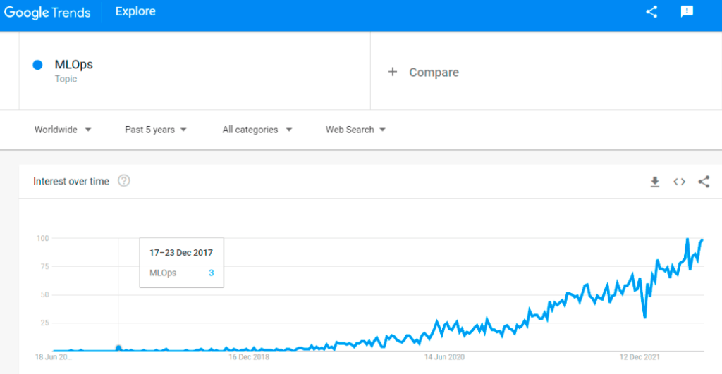 Deployment and maintenance of the ML model in application is challenging and that is highlighted in the 2015 paper. The growth of ML implementation is exponential in the market and demand of pipeline automation also increases day by day. The MLOps keyword search started from 2017 and exponential growth noticed from 2019, you can see in Google Trend in below image.
