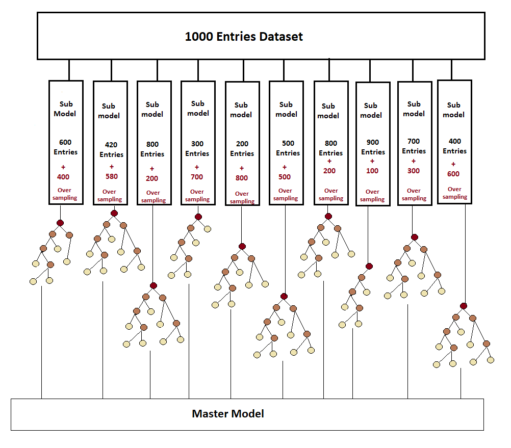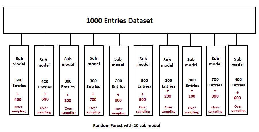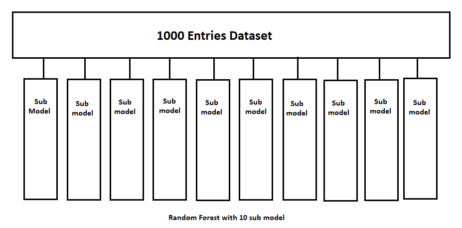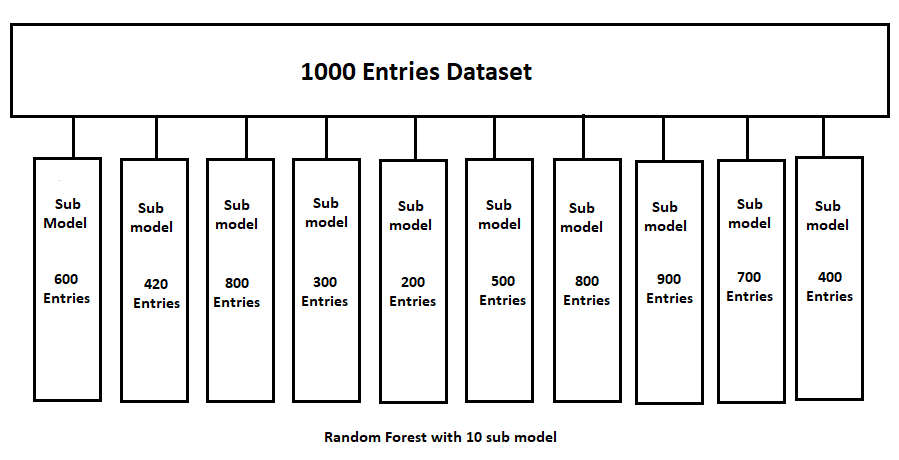 Suppose there is a dataset with 1000 entries and 10 sub models in this random forest. Now, while working on this in the ensembling method, the data will be randomly distributed among these ten sub models.