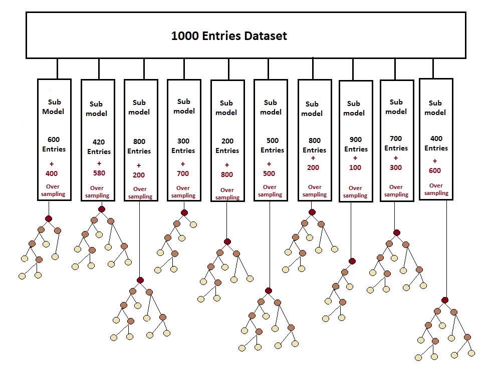 A total of 10 sub-models are now composed of the original amount of data. Now the next procedure to make the tree is completely similar to the decision tree. That means selecting the best root node using entropy or the Gini index and growing the tree further in the same manner.