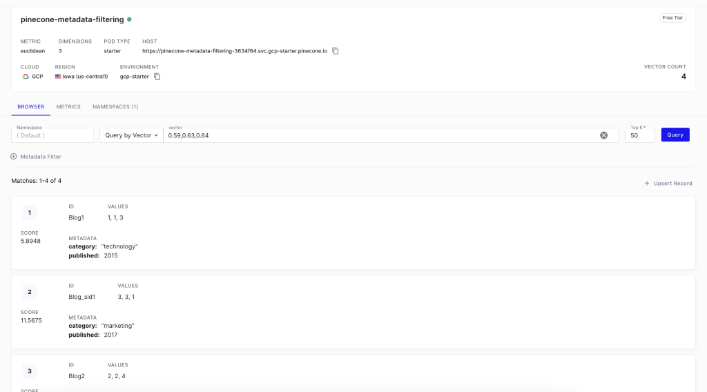 Here , we can see our vectors inserted in Pinecone index named “pinecone-metadata-filtering.”
