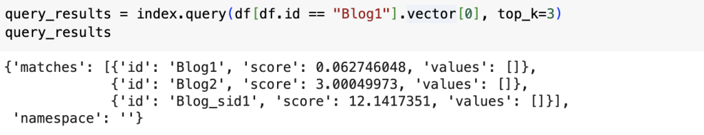 We have got the closest top 3 vectors to the query vector as per the set vector similarity metric. It can be cosine similarity , euclidean distance or dot product similarity for Pinecone.