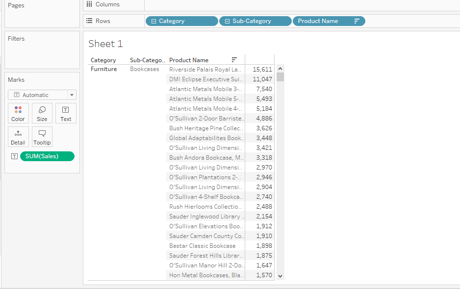 Dragging the columns: category, subcategory, and product in rows, whereas taking the Sum(sales) in the text tab.