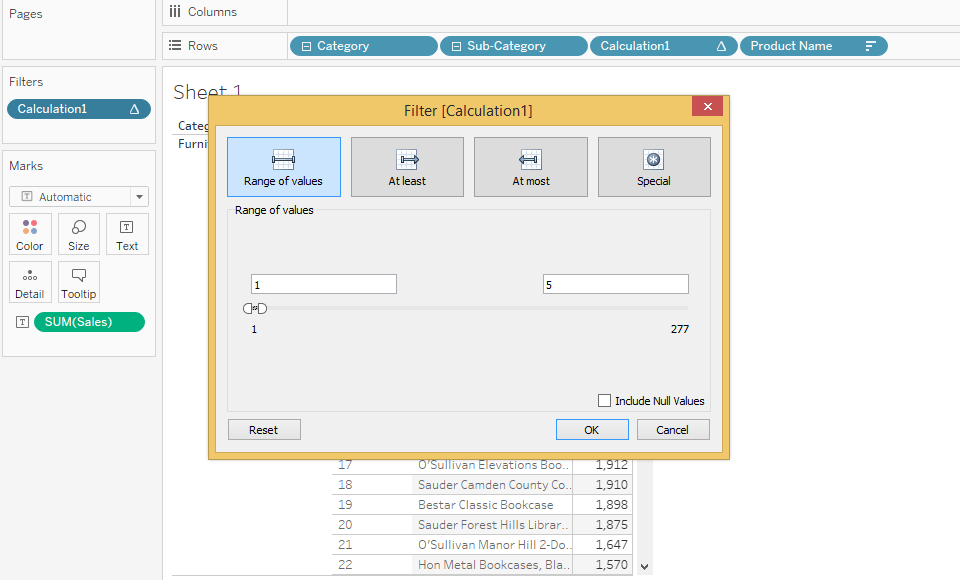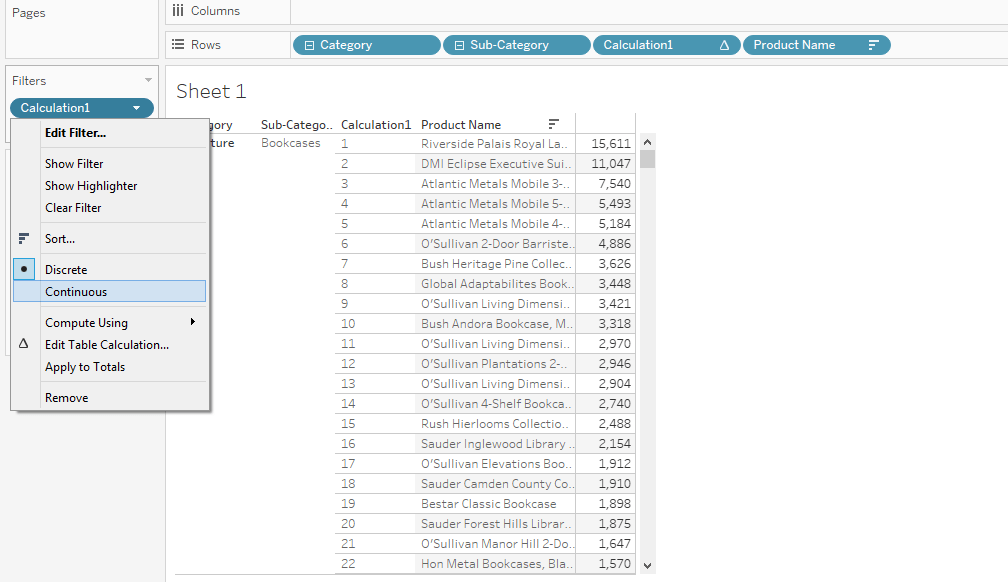 Using the Ctrl+ click the Calculation1 from the rows and drag it into Filters. Right-click on the filter and convert the filter to Continuous as shown below.