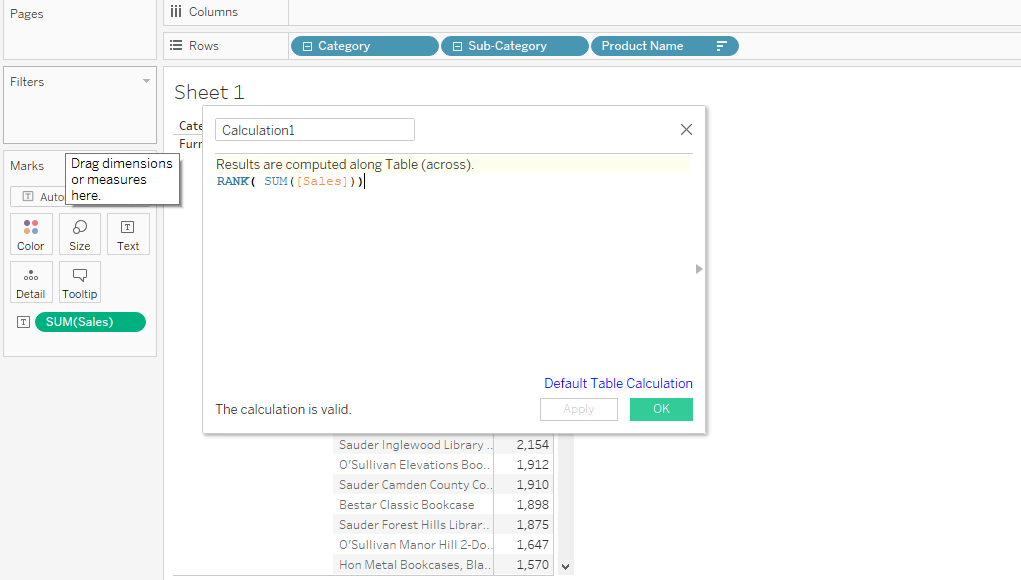 Create the Calculated Field from the Analysis option on the tableau menu bar. Add the below formula for the Rank() function. From the Measures pane, convert the Calculation1 field into Discrete.