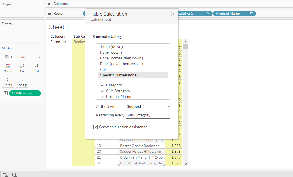 Step 3: Pull the Calculation1 field into the Rows and Edit Table Calculations