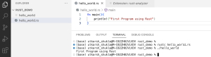 As we can see here, the entry point to our Rust file is the main function. we are printing some random text here, using print line command that is println!