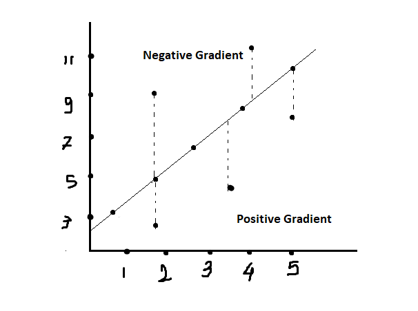 If a data point lies below the linear line, it means the predicted value (on the line) is greater than the actual value. The loss function may increase in this case as well, leading to a positive gradient. The algorithm then uses this positive gradient to update the parameters in the direction that reduces the loss, bringing the predicted value closer to the actual value.