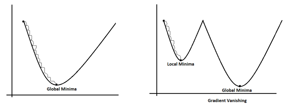 Memorize the above ball and basket game; if the learning rate is too small, we face the gradient vanishing problem. Like in his first attempt, the boy couldn’t achieve success, and the ball fell before the basket. Similarly, gradients can’t reach a particular destination, which is known as the global minima. Instead of that, it stuck at the local minima.