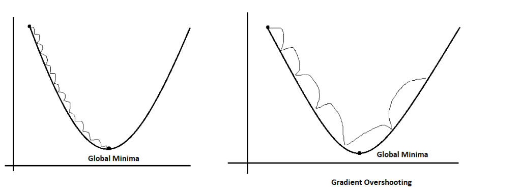 Again, move to the example of the ball and basket game; here, at the second attempt, when the boy increased his power and throws, the ball fell after the basket. That means if you apply more power than required, it will go away from your destination. Similarly, if there is a large learning rate, one might face the gradient overshooting issue, where gradients sometimes increase and sometimes decrease, and in this cycle, there might be possibilities of losing global minima.