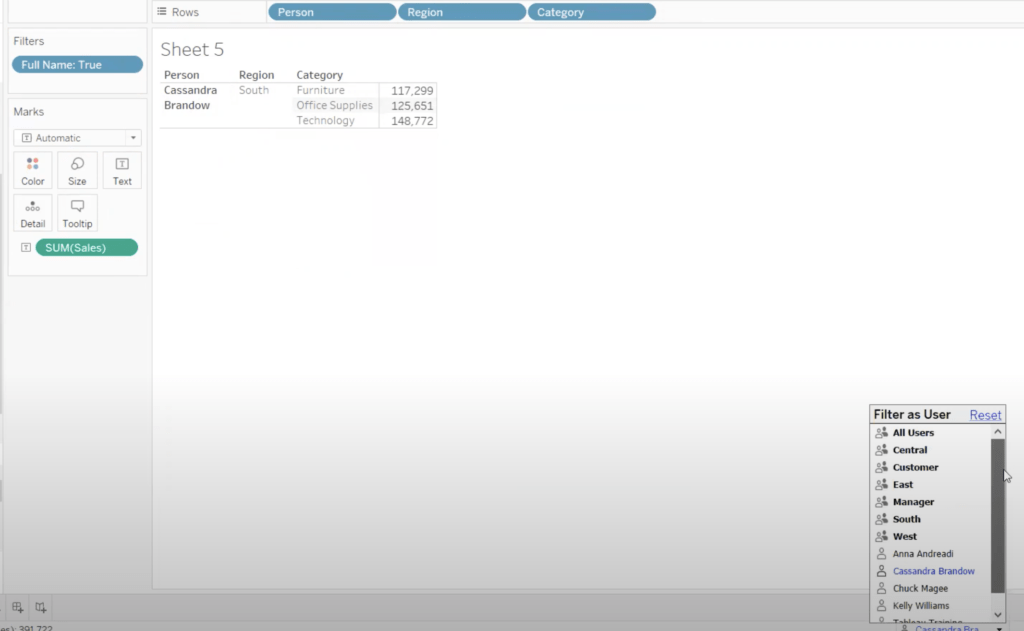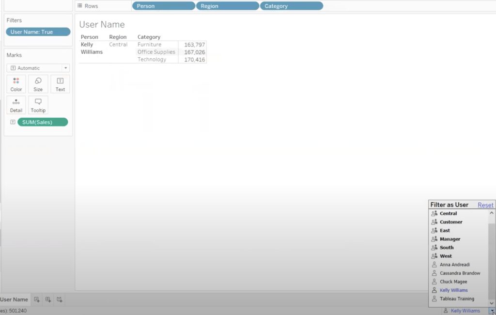 If we want to show the specific data to a specific user only, then this will help to achieve the same. Here we have created a calculated field Full Name. Now, if we drag this calculated field into the filter and set it TRUE then only the respective server user can see his own region’s data.