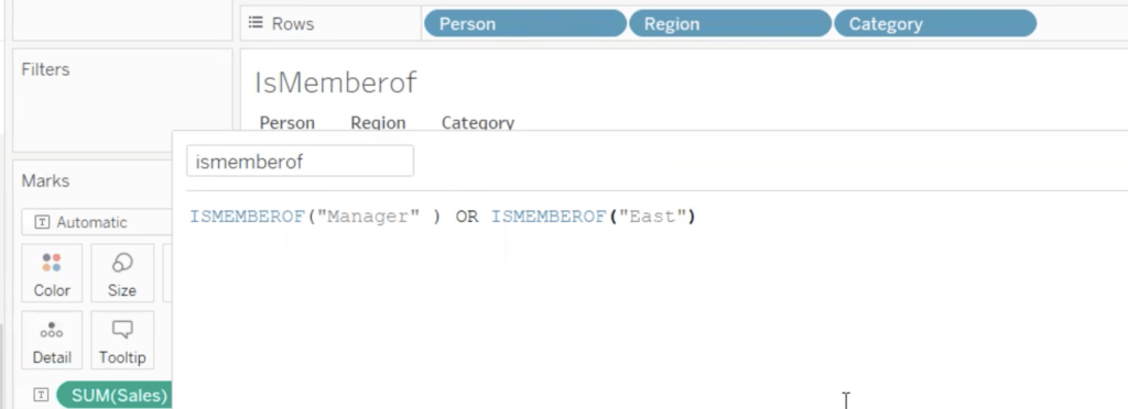 4. ISMEMBEROF: TThis function will return a boolean value. It will return True if the person who is currently using Tableau is a member of a group that matches the given string. The function will return a value only if the user is signed in to Tableau Server or Tableau Online otherwise the function will return NULL.