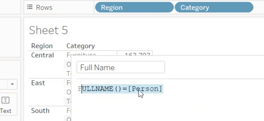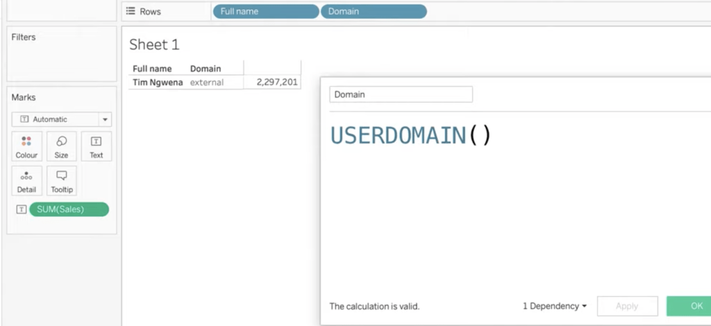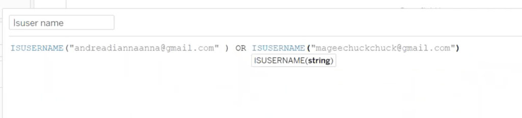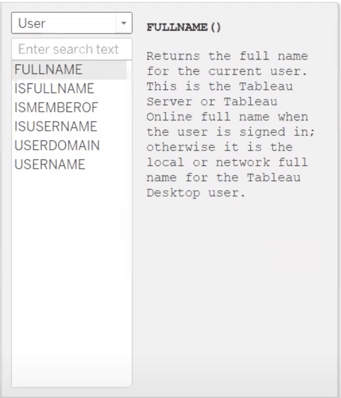 - FULLNAME: This function will return the full name of the desired user. When we use this as a filter, we can use a calculated field to create a user filter that only shows relevant data to the person that is signed in to the server.
