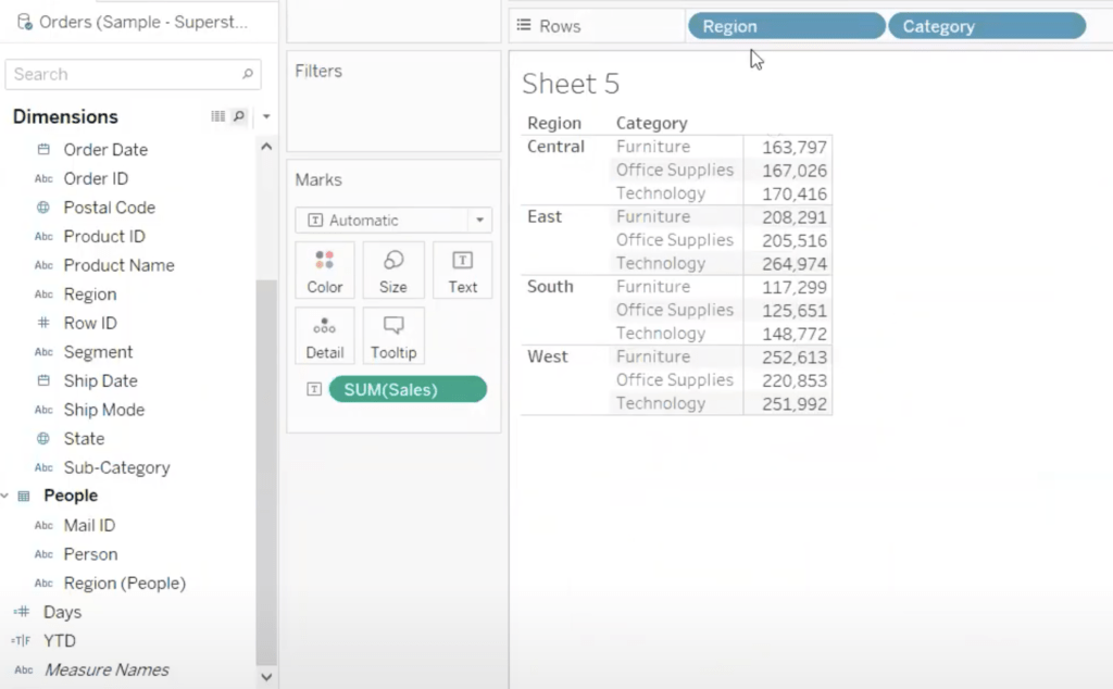 Consider we have Sample SuperStore dataset where we want to apply the User functions. Below are the sample statistics that we are focussing on just to explain how these functions are used. We have found the sum of sales on the basis of region and category.